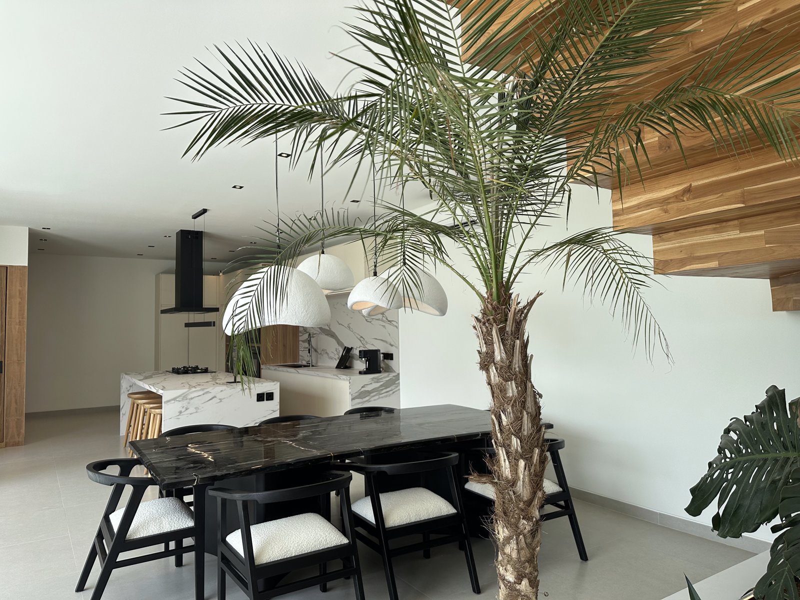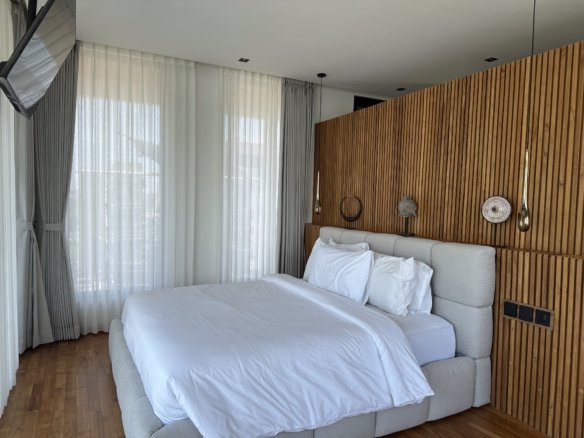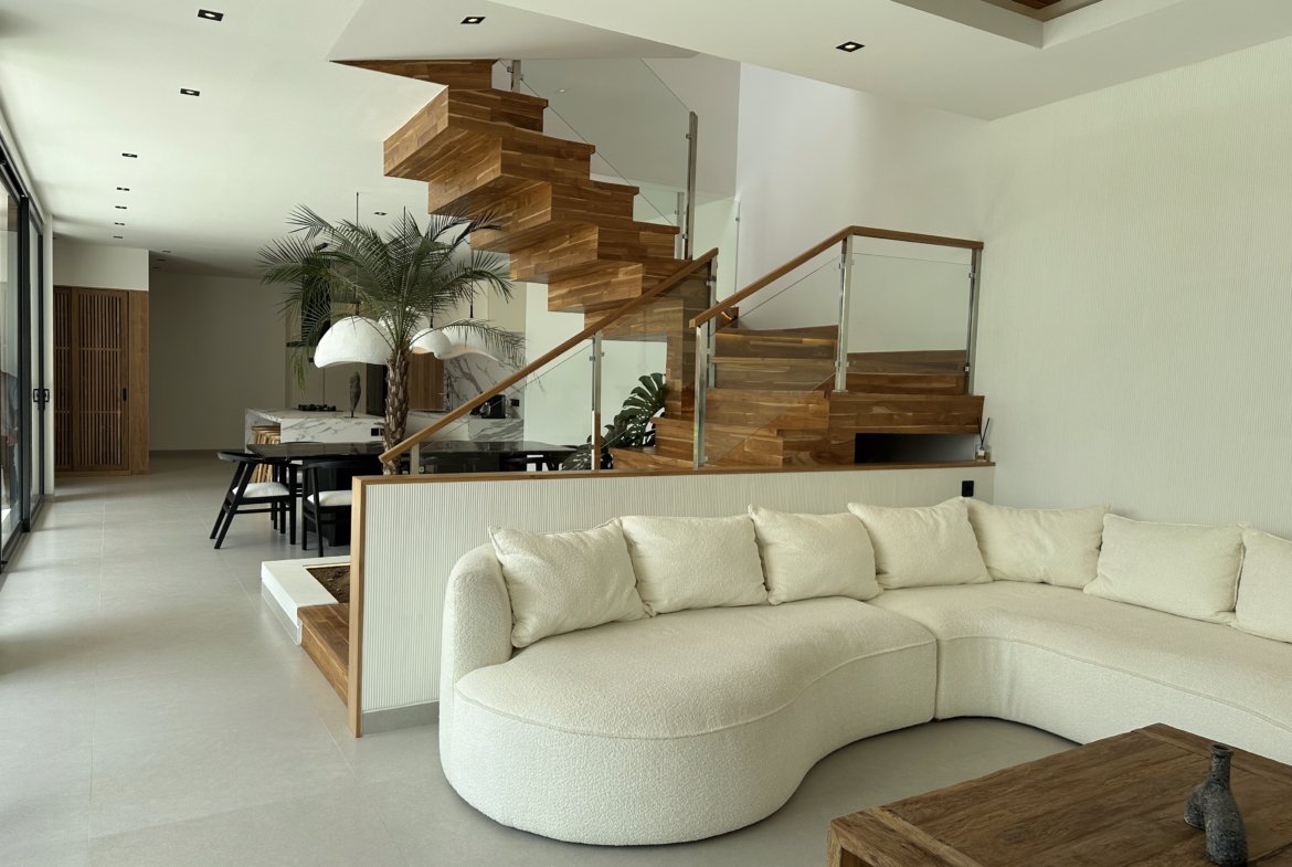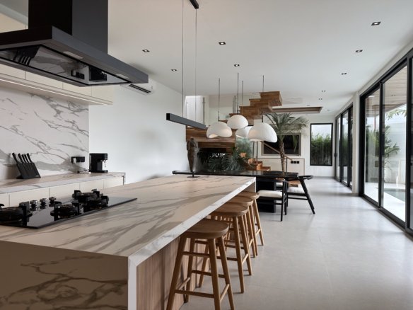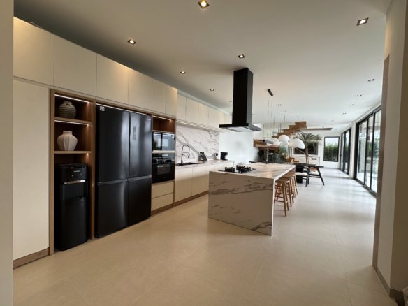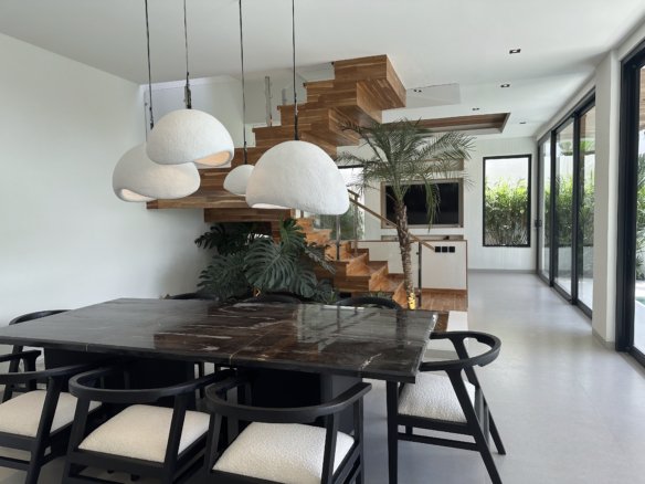 This exquisite 4-bedroom villa is defined by its sophisticated and highly functional design. The heart of the home is an elegant, fully-equipped kitchen featuring premium Häfele appliances, including a refrigerator, microwave, oven, and a four-burner stove, all complemented by integrated LED cabinet lighting. This space flows seamlessly into a cozy dining area, unified by a stunning petrified wood dining table and designer chairs that create a perfect blend of modern luxury and natural elegance.