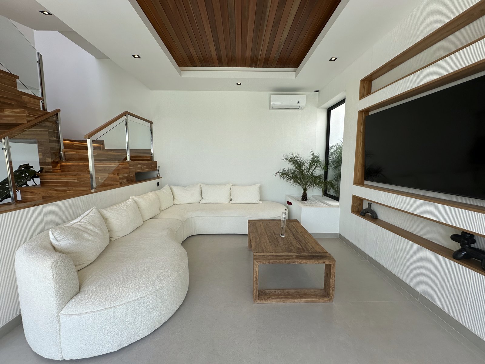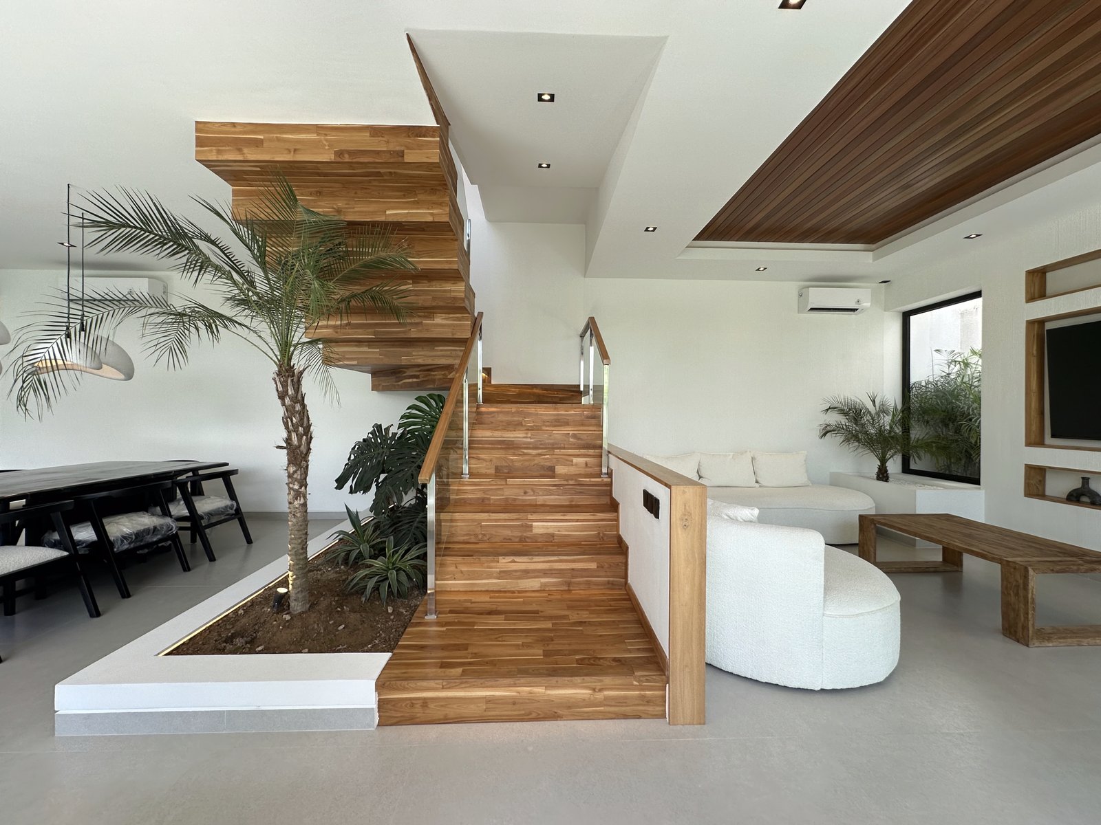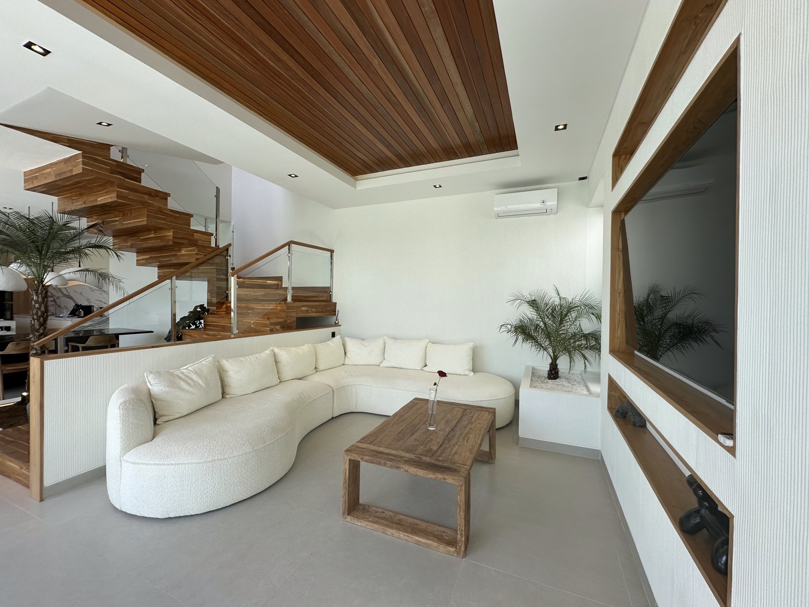 This exquisite 4-bedroom villa is defined by its sophisticated and highly functional design. The heart of the home is an elegant, fully-equipped kitchen featuring premium Häfele appliances, including a refrigerator, microwave, oven, and a four-burner stove, all complemented by integrated LED cabinet lighting. This space flows seamlessly into a cozy dining area, unified by a stunning petrified wood dining table and designer chairs that create a perfect blend of modern luxury and natural elegance.