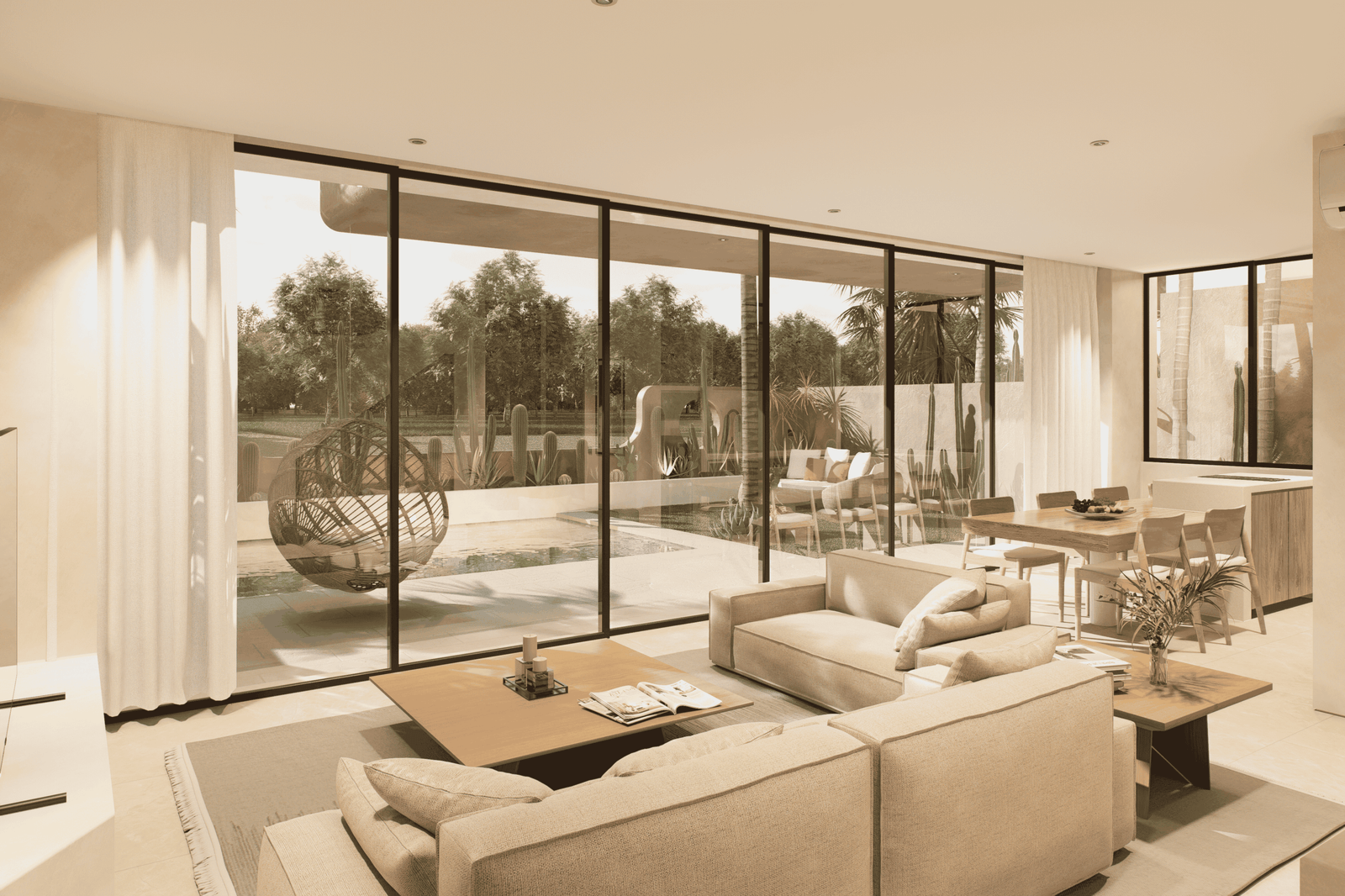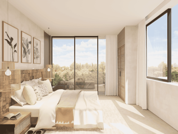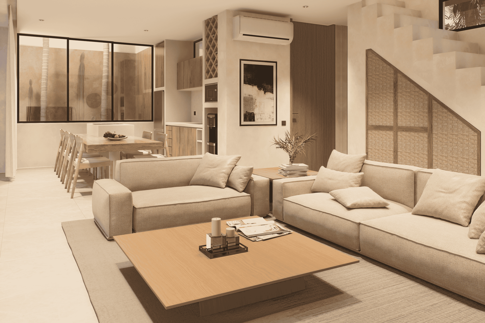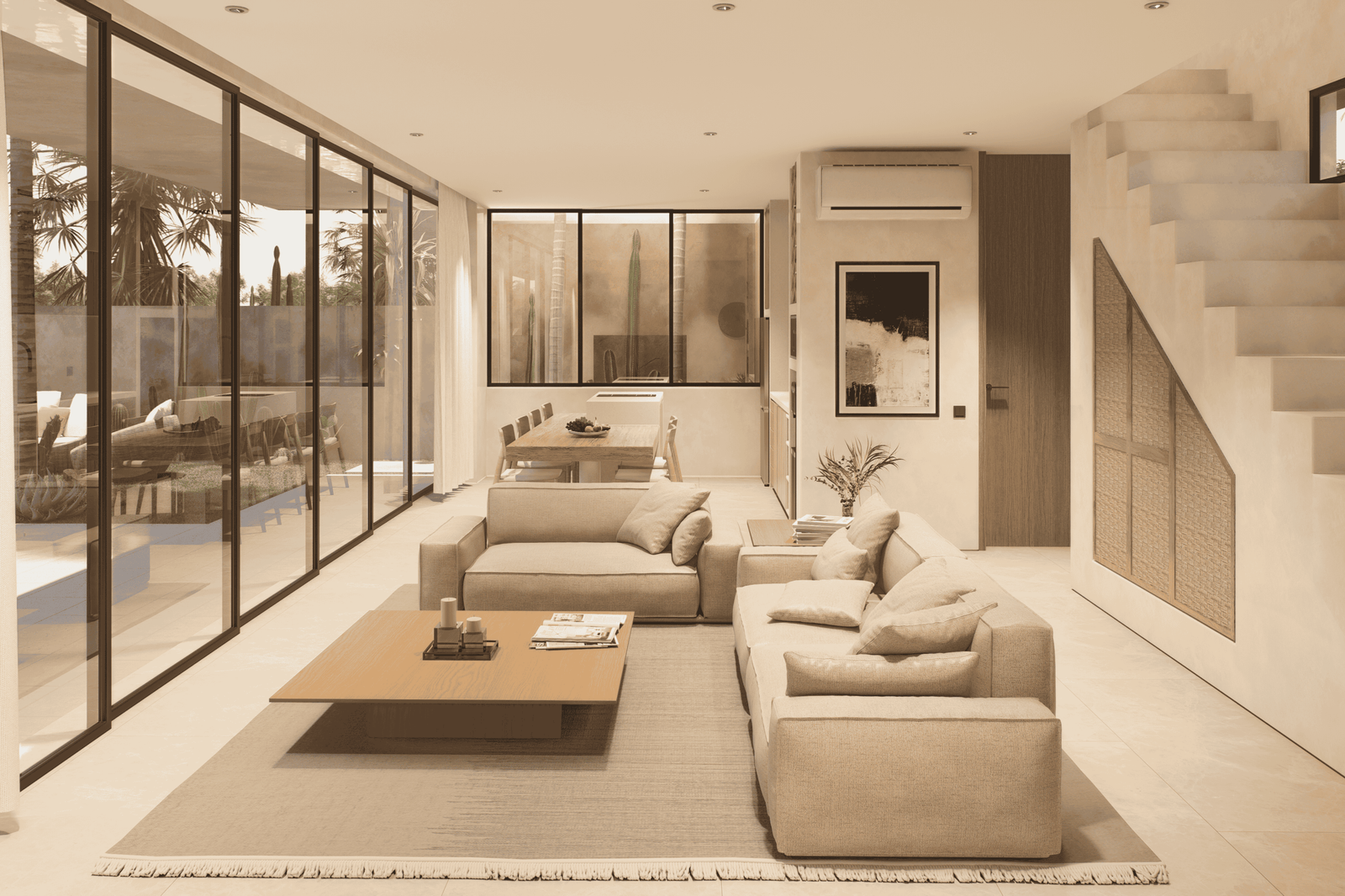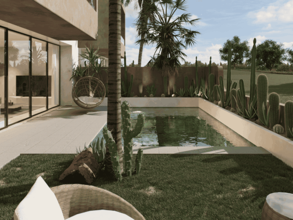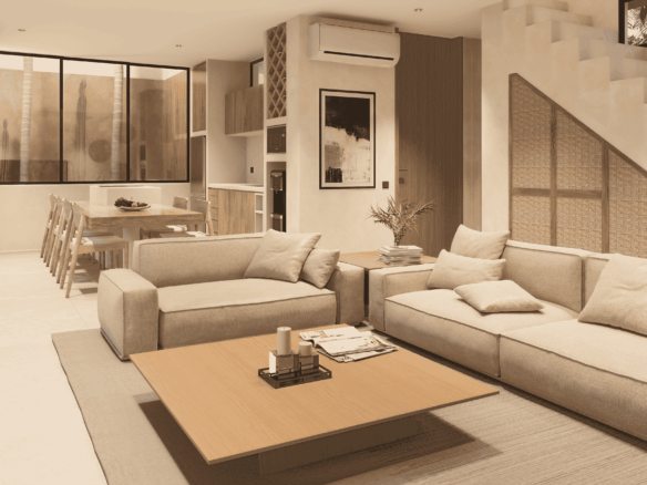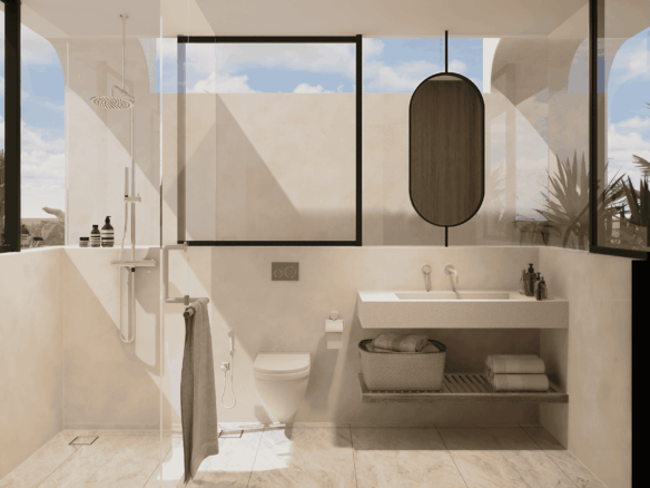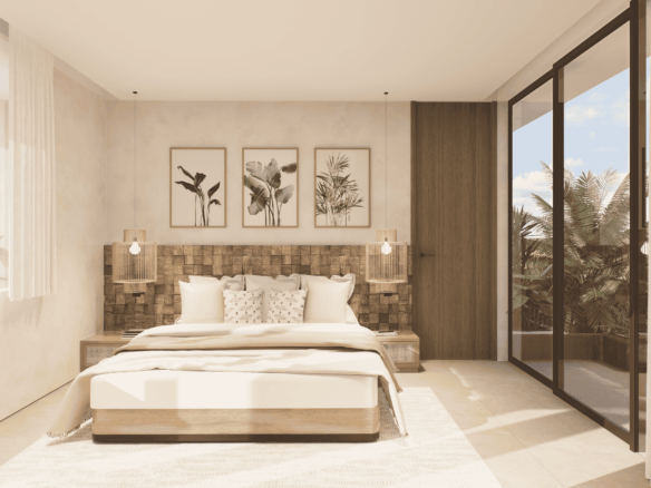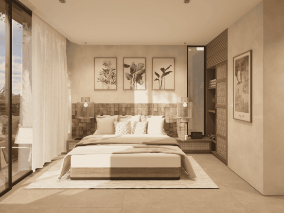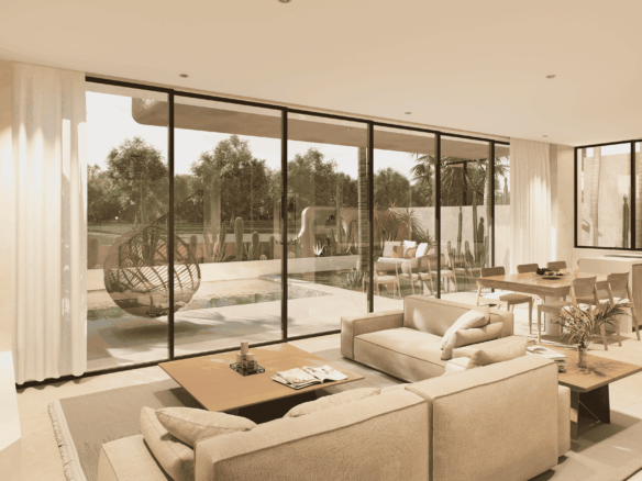 Just a 300-meter walk from the shore, these desert-inspired villas bring a refined sense of tranquility to every detail. Expansive floor-to-ceiling glass walls flood the interiors with natural light, creating a seamless connection between indoors and out.