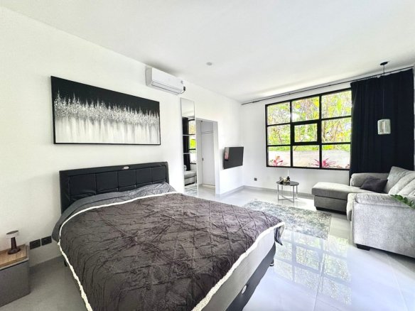 The villa itself is thoughtfully designed, featuring 2 spacious bedrooms, 4 bathrooms, and a dedicated office space. The heart of the home is a magnificent 70m² open-concept kitchen and living area, perfect for entertaining. It is complemented by exceptional amenities including a 6x3 meter swimming pool, a large parking area for vehicles, and practical additions like a laundry room with a washing machine, water filters, and significant storage space. The interior is bathed in natural light thanks to soaring 9-meter ceilings with skylights, creating an airy and uplifting atmosphere.