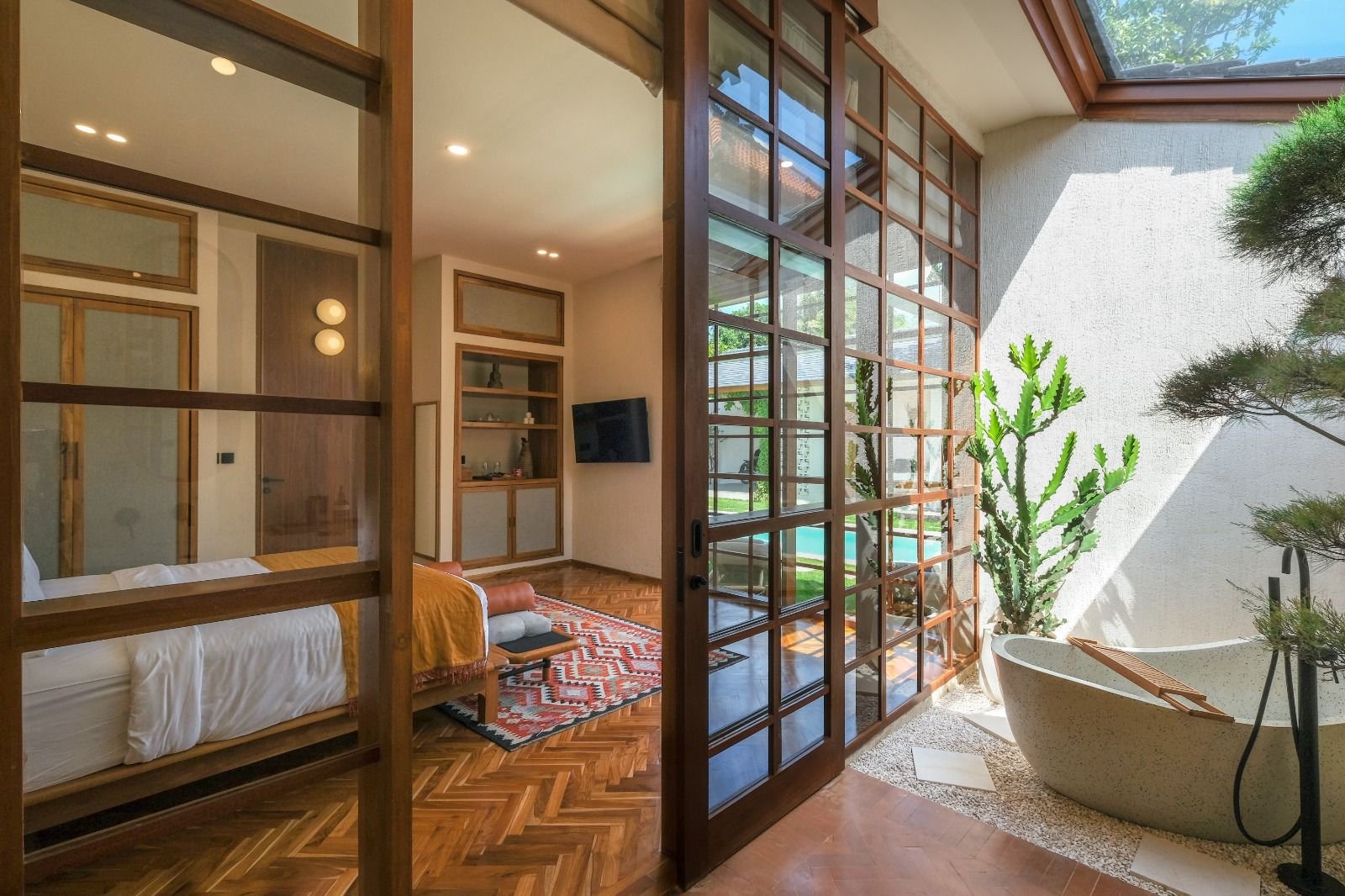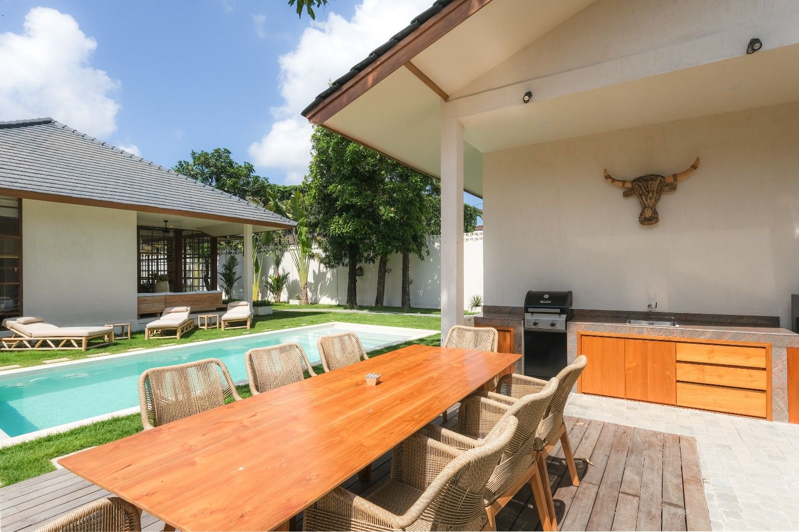 This Villa is a 3-bedroom property in the vibrant Sunset Road district, perfectly positioned for both exploration and relaxation. The villa offers convenient parking and is just 10 km from Ngurah Rai International Airport. You’ll be within easy reach of top Seminyak attractions, including a short 5-minute drive to the sands of Seminyak Beach and the high-concept Cocoon Beach Club, with cultural sites like Petitenget Temple also nearby.