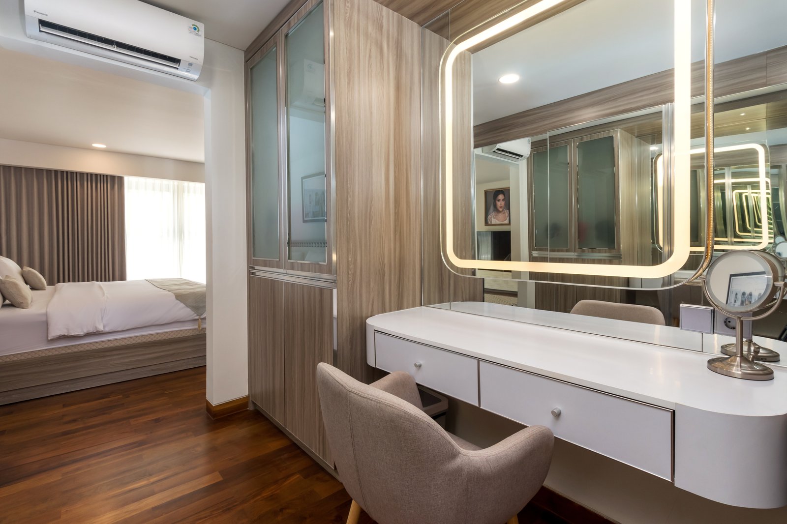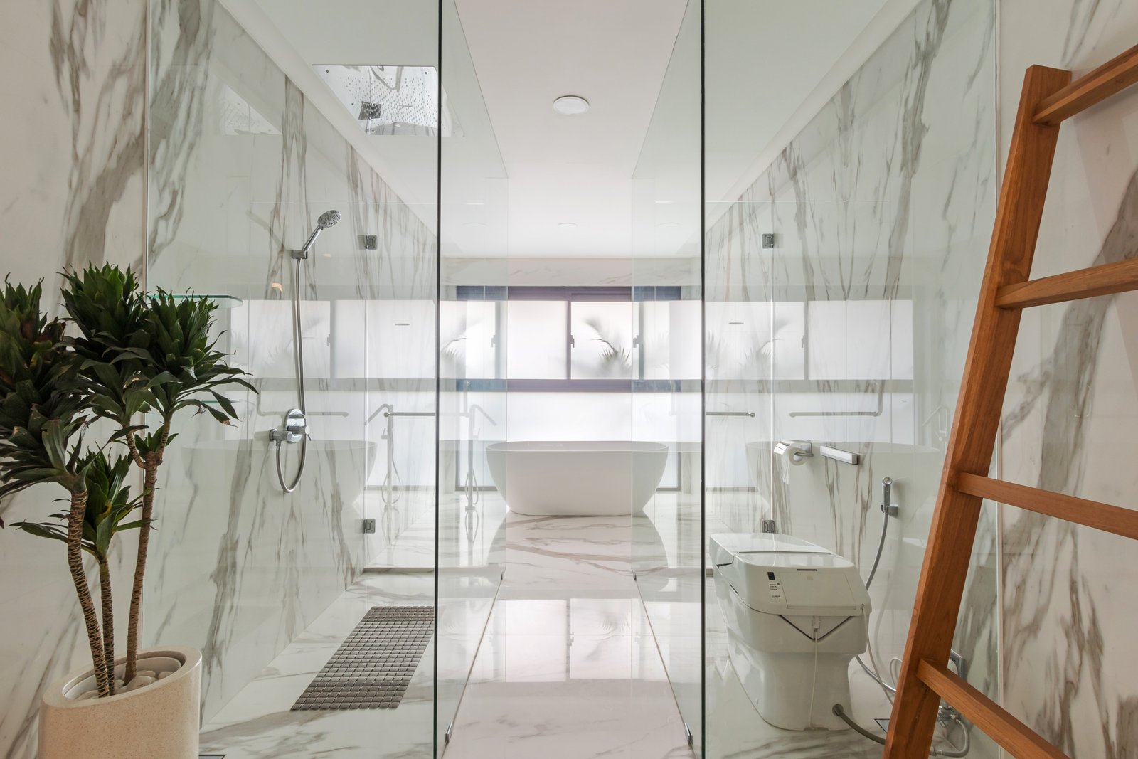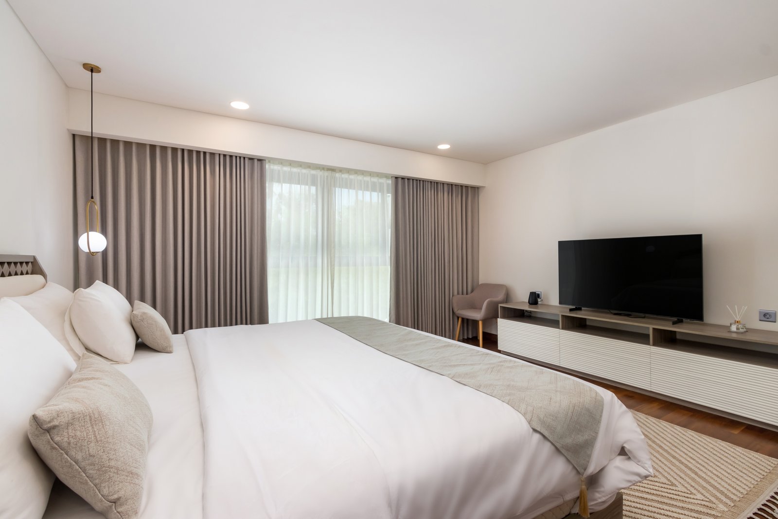 The master bedroom comes with a walk-in closet and a stunning en-suite bathroom featuring smart glass and a smart toilet. The two additional bedrooms are spacious, each with generous wardrobes and plenty of natural light.