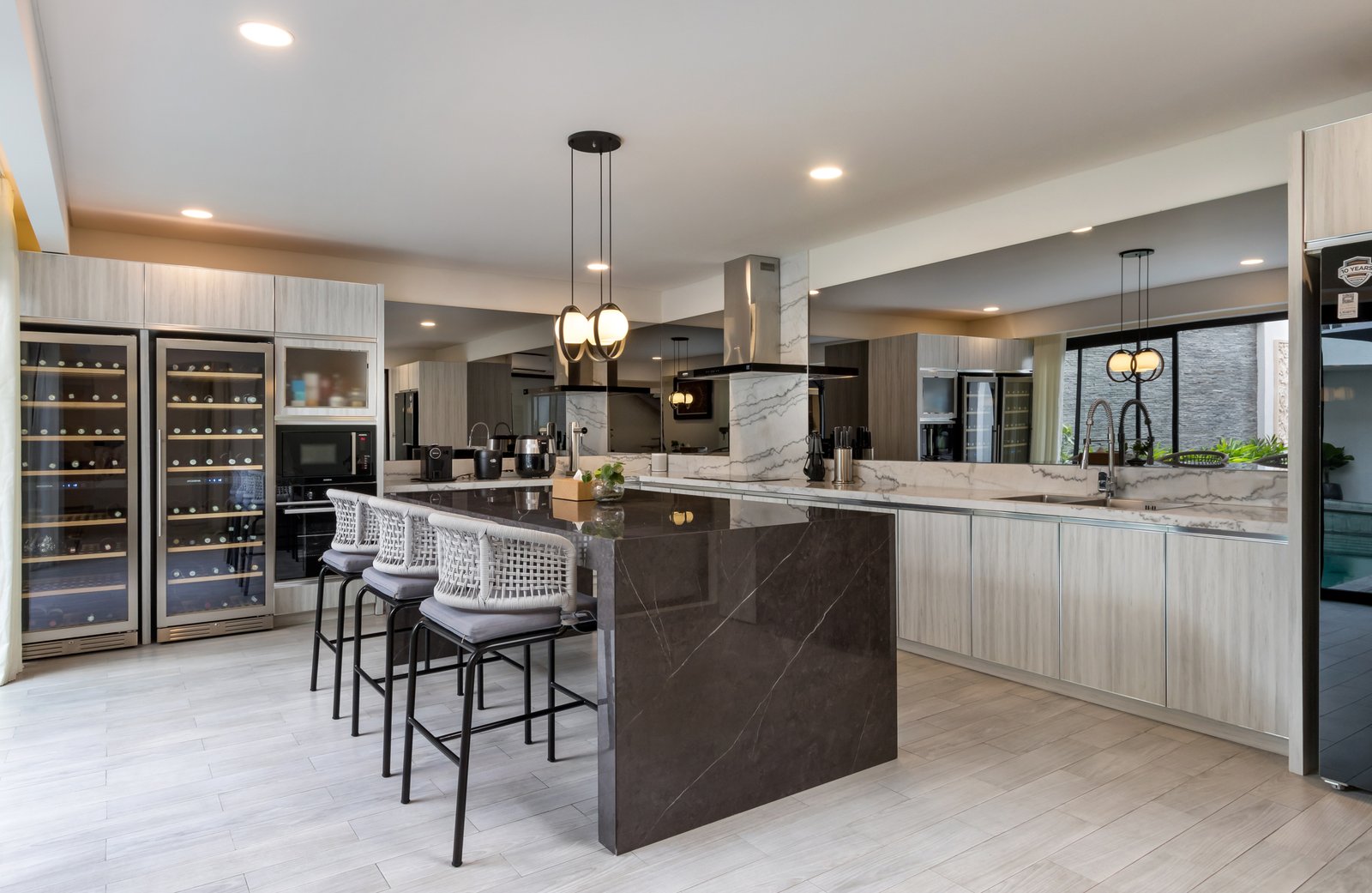 The modern kitchen is a chef’s dream, complete with two wine fridges, electric stove, oven, microwave, fridge, and sleek Quadra and marble benchtops. The bright and elegant enclosed living and dining area adds to the comfort and charm of the home.